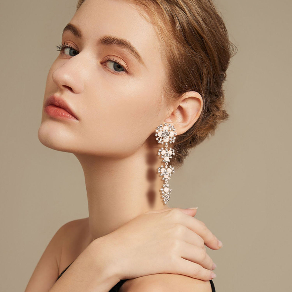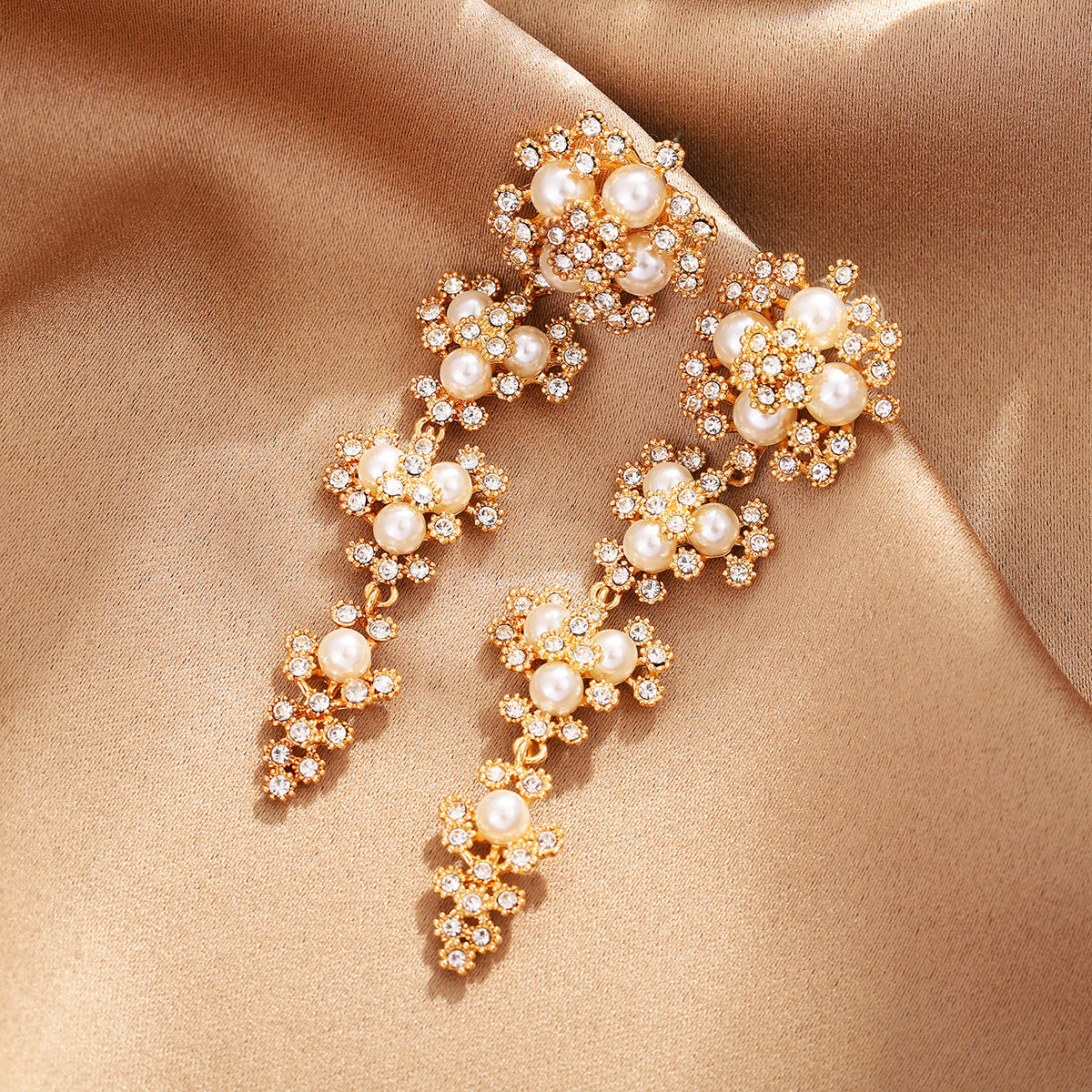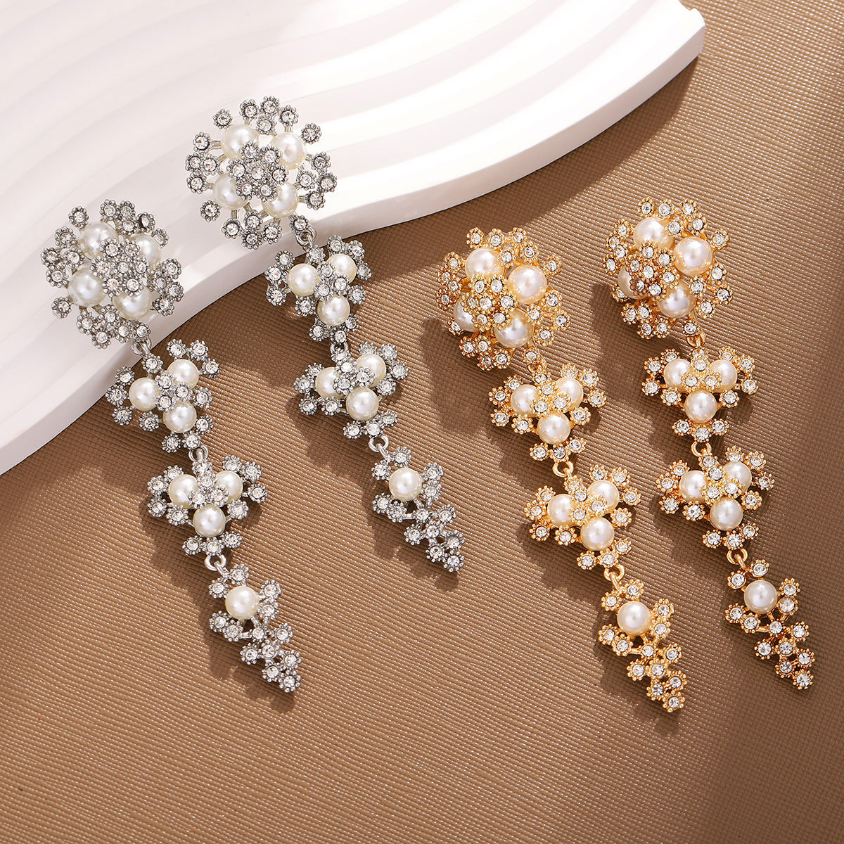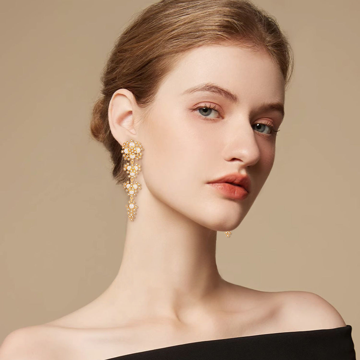 This classic floral tassel earring combines a luxurious design with sparkling rhinestones and pearls, showcasing elegant and high-end charm. Its long, bold style features exaggerated floral elements and flowing tassels, adding a wow factor to any look—perfect for evening parties, dinners, or everyday wear. Made with high-quality materials, it is both fashionable and durable, making it an ideal choice for wholesale and retail. Let this earring be your perfect accessory to express your personality and taste!