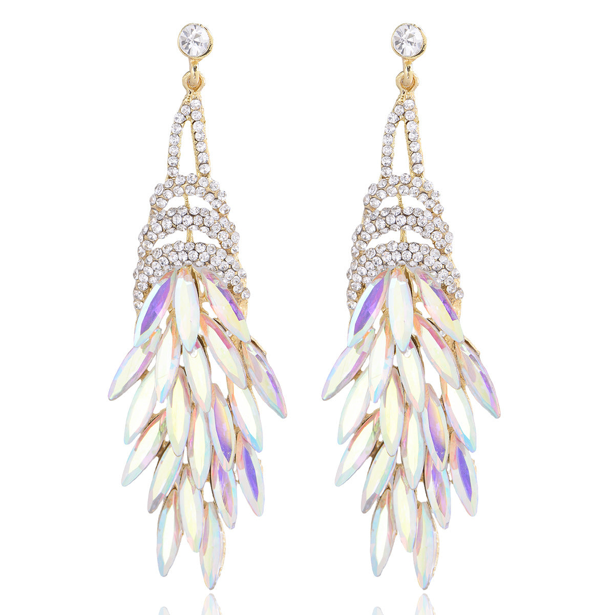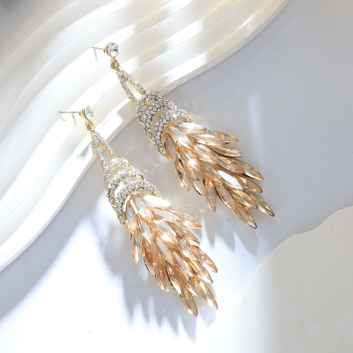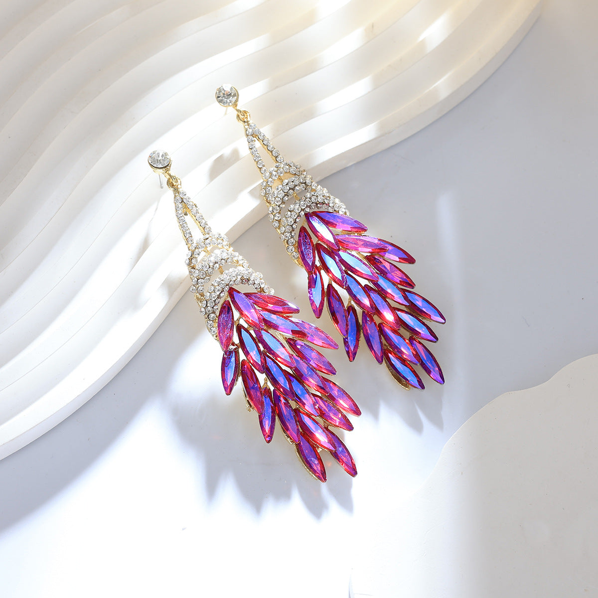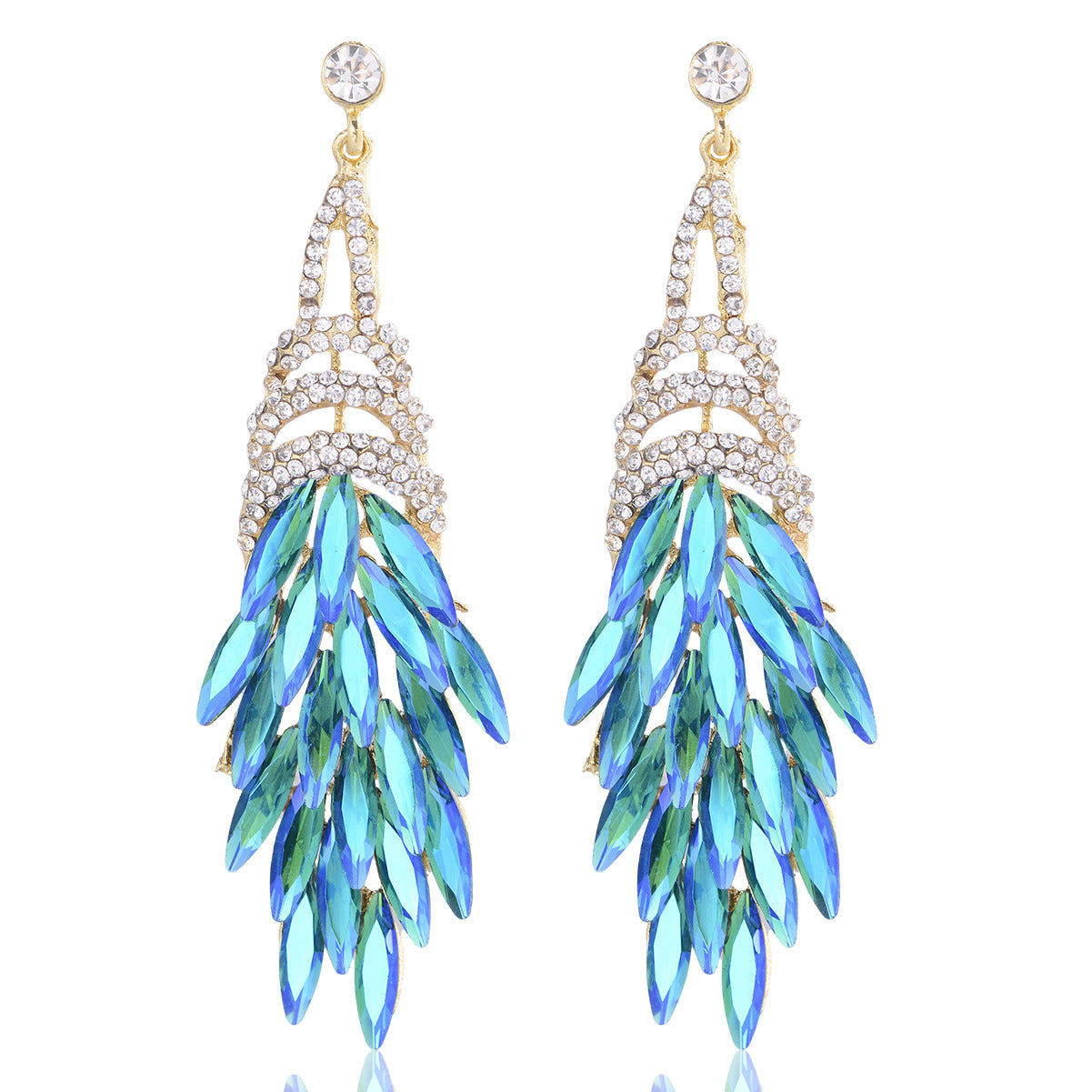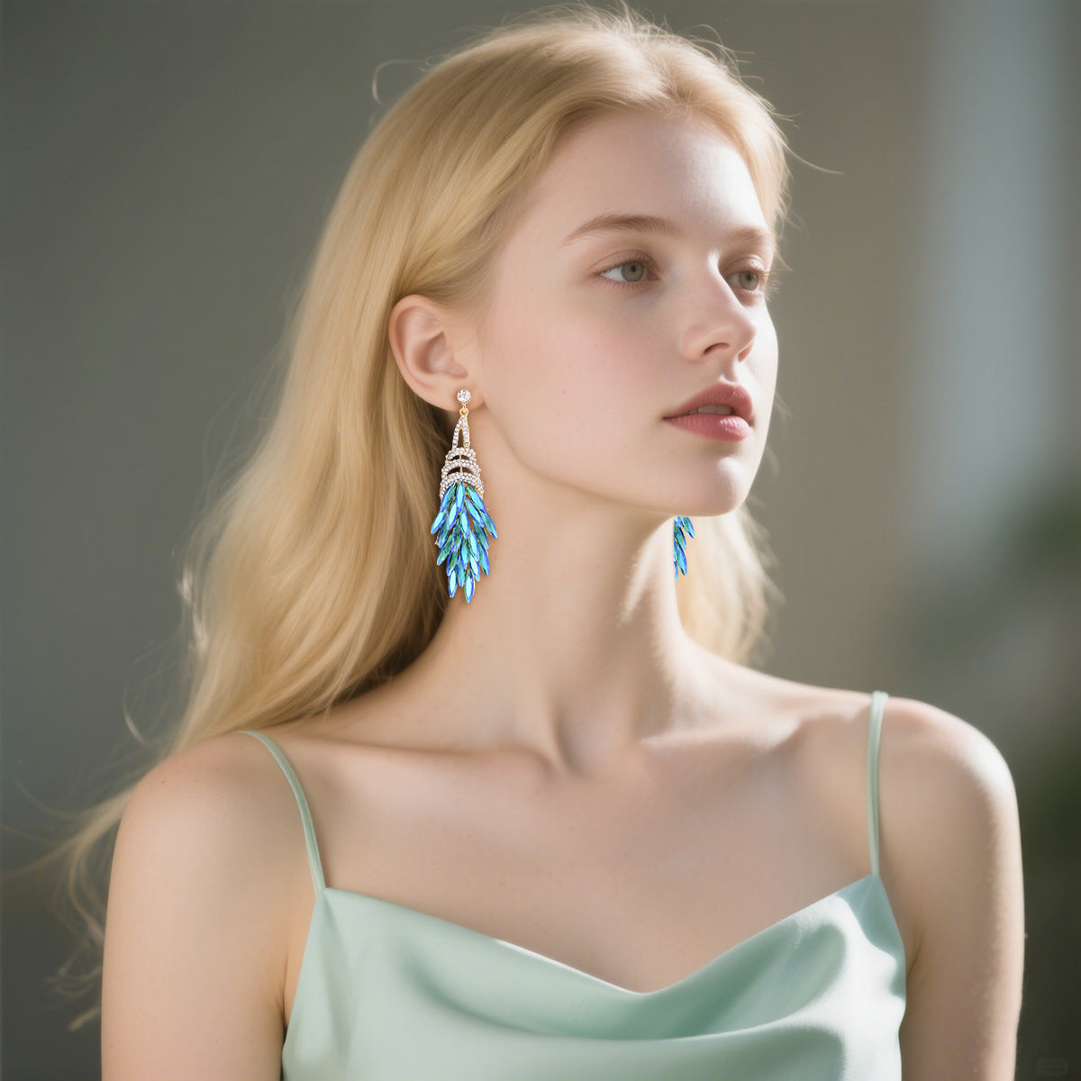 This pair of long tassel earrings combines a luxurious and personalized design, highlighting a woman's noble and elegant demeanor. Made with alloy material and adorned with sparkling gemstones, they offer a high-end texture. The tassel features blue metallic leaves, creating a dynamic visual effect that is both stylish and versatile. Whether paired with casual outfits or formal attire, these earrings add a touch of unique charm, allowing you to stand out and exude confidence and grace in any setting.
